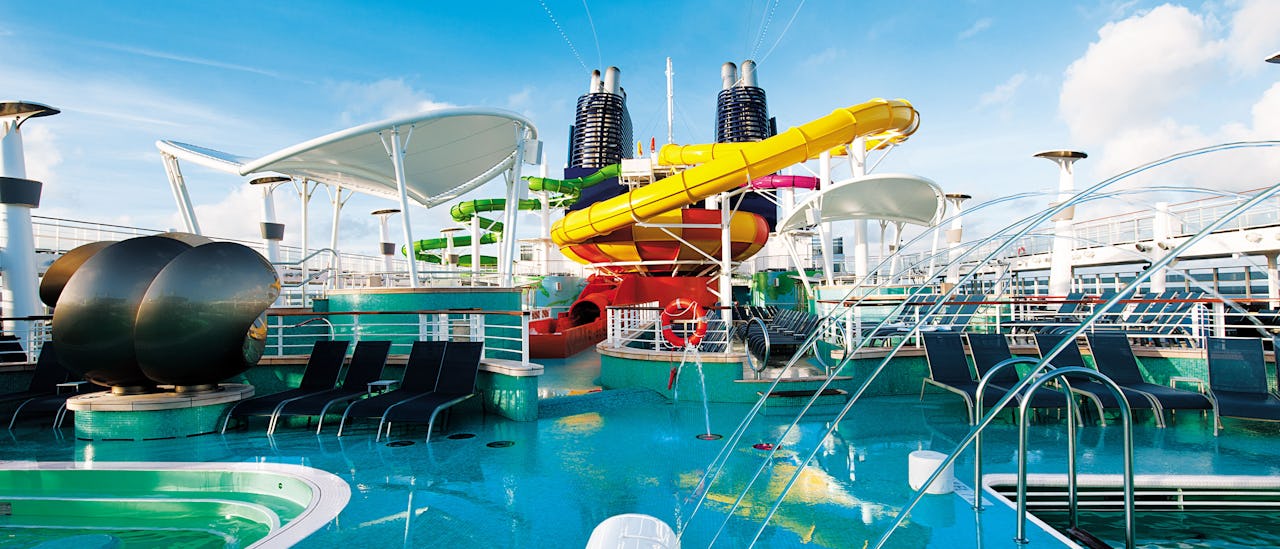 Erleben Sie die wunderbare Aussicht auf das Meer von einer Vielzahl von Pools, dem Spa und dem Fitnessstudio an der Spitze des Schiffes.