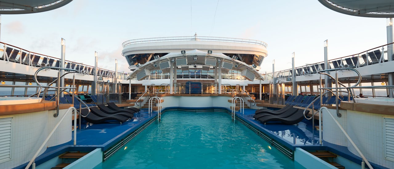 Erleben Sie von verschiedenen Pools, dem Spa und dem Fitnessstudio an der Spitze des Schiffes einen atemberaubenden Blick auf das Meer.