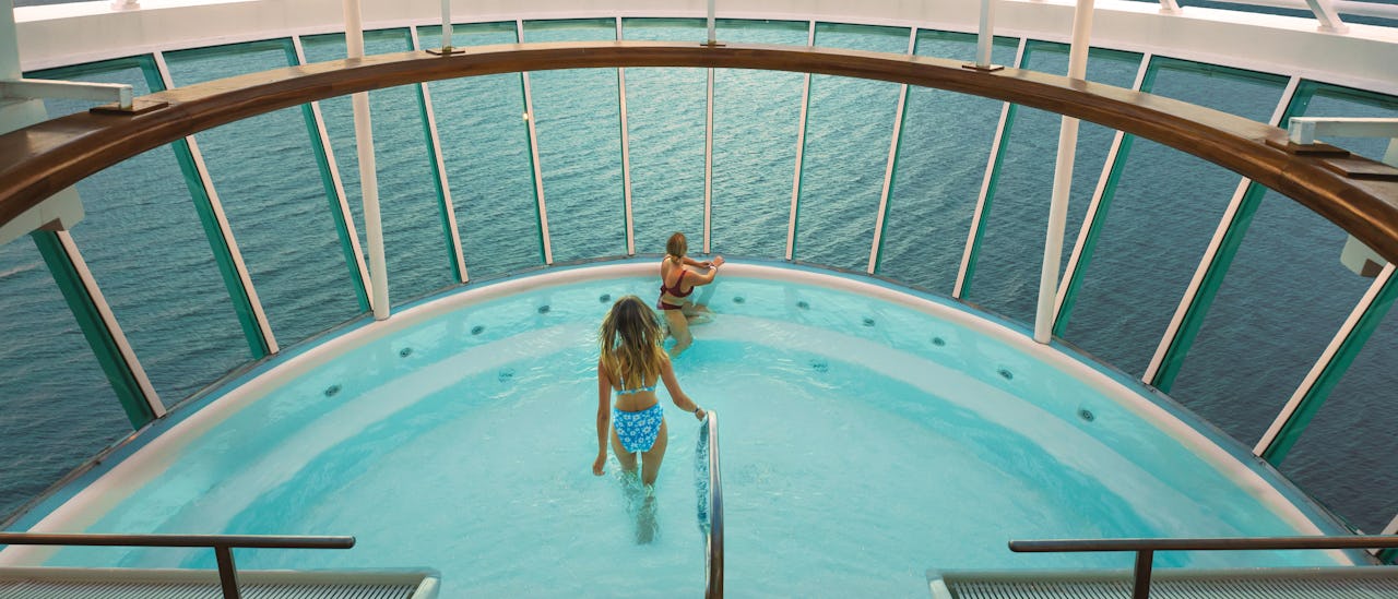 Entspannen Sie sich im Whirlpool, der außerhalb des Schiffes 36 Meter über dem Meeresspiegel hängt.